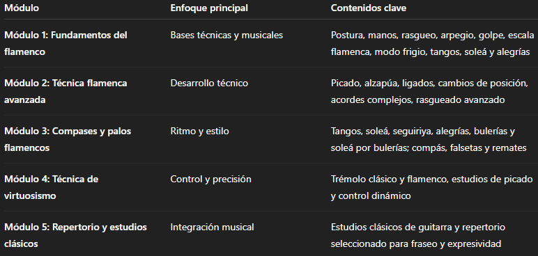 El programa integra los fundamentos del flamenco —palos, compás, falsetas tradicionales y recursos de acompañamiento— con un enfoque cercano y actual. Se promueve una relación viva con la tradición, entendiendo el flamenco como un arte en constante transformación.